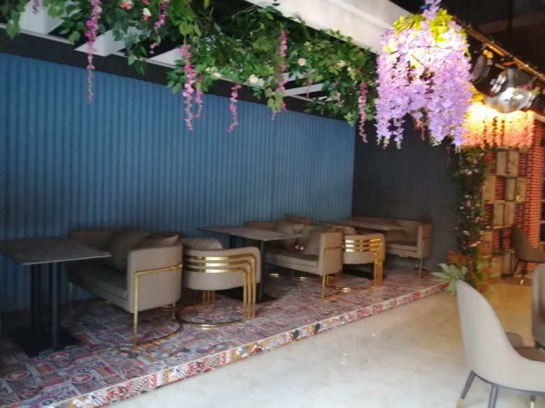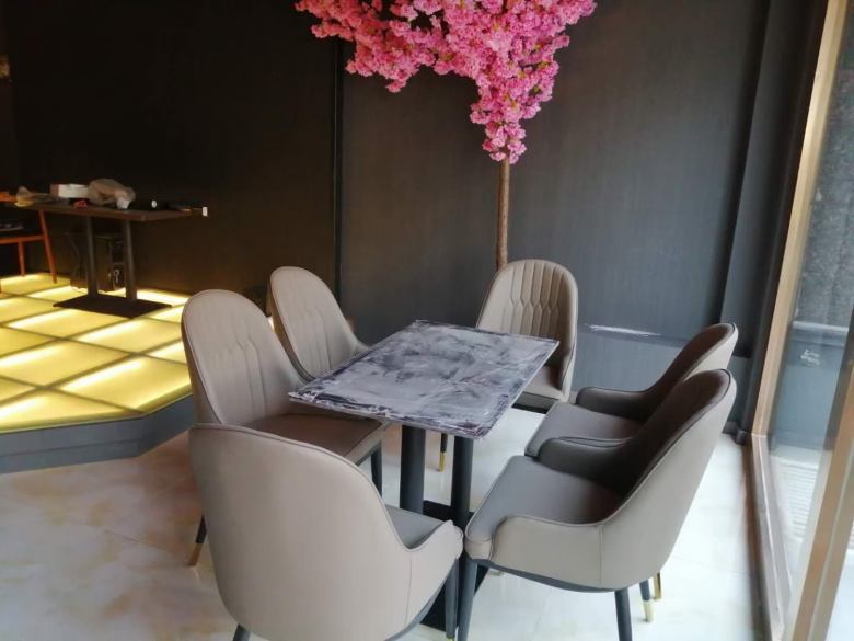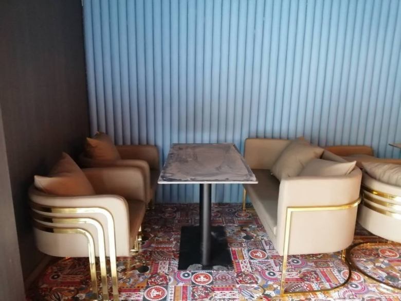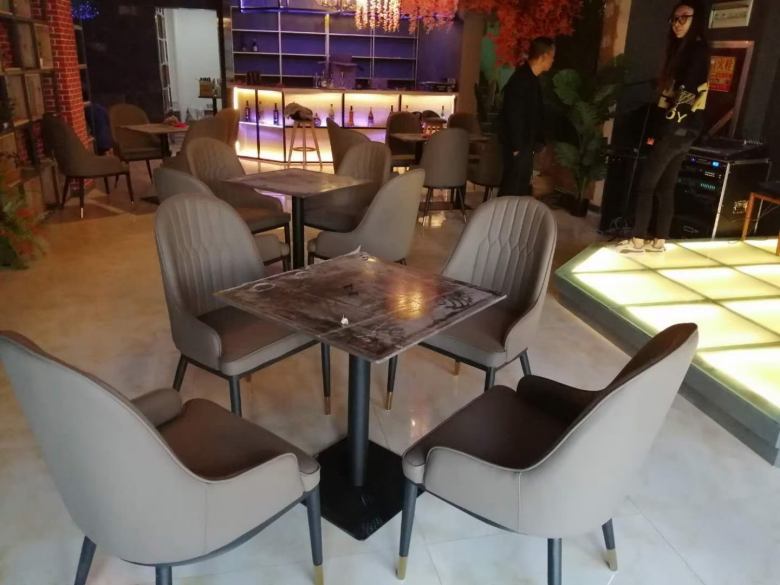 無烊音樂餐吧采購的桌子采用巖板臺面和鐵藝桌腿組合而成,巖板餐桌椅大氣耐用,特有的石材色調能夠迅速提升店面的檔次。卡座沙發定制以及沙發椅均有嚴格要求,我廠依據客戶需求完美呈現出了家具成品。
